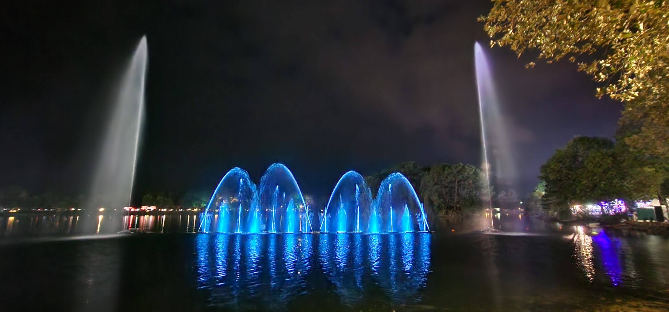 Les fontaines géantes possèdent une grande surface de visibilité pour être vues du plus grand nombre. Chaque spectacle a une chorégraphie de jets d’eau et de musique différente. Les jets d’eau jaillissent de toute part pour atteindre des hauteurs impressionnantes. Les projecteurs de lumière associés à des jets d’eau orientables offrent de nombreuses combinaisons.