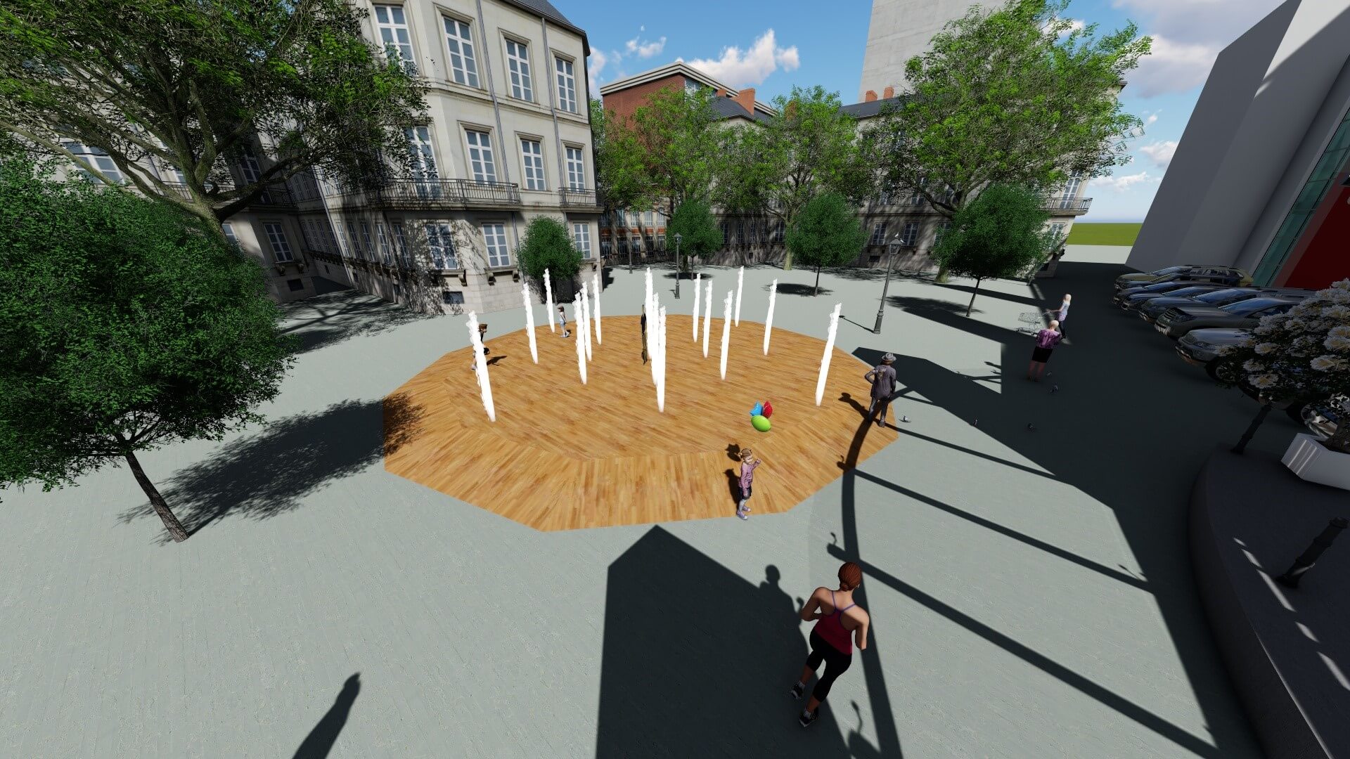 En journée, nos fontaines sèches sauront apporter du charme à vos espaces. Les jets d’eau seront de faibles hauteurs dans le but d’apporter sérénité et bien-être ainsi que de permettre aux petits comme aux grands de jouer avec les jets farceurs. Cette plateforme aqualudique, constituée d’une multitude de jets, laissera apparaitre çà et là des jets d’eau de différentes hauteurs. C’est une solution simple pour lutter contre les îlots de chaleur de plus en plus présent dans nos villes. En soirée, nos fontaines danseront et s’illumineront au rythme de la musique pour plusieurs spectacles magiques et captivants.